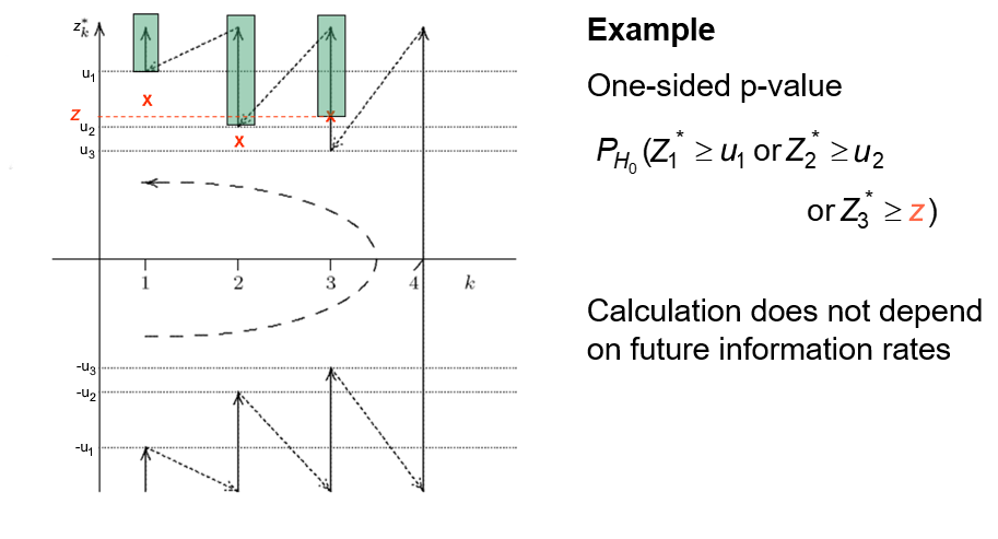This \(p\)-value can only be calculated once, at the end of the trial